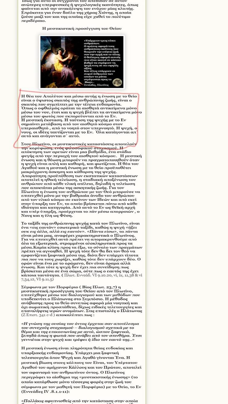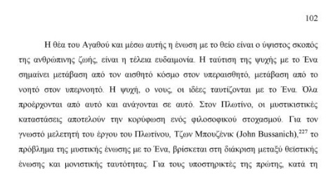 […] Η ταύτιση της ψυχής με το Εν σημαίνει μετάβαση από τον αισθητό κόσμο στον υπεραισθητό , από το νοητό στον υπερνοητό. Η ψυχή, ο νους, οι ιδέες ταυτίζονται με το Εν. Όλα κατάγονται απ’ αυτό και ανάγονται σ’ αυτό.