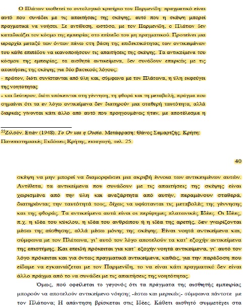 «Ὁ Πλάτων υἱοθετεῖ τὸ ὀντολογικὸ κριτήριο τοῦ Παρμενίδη: πραγματικὸ εἶναι αὐτὸ ποὺ συνάδει μὲ τὶς ἀπαιτήσεις τῆς σκέψης, αὐτὸ ποὺἡ σκέψη μπορεῖ πραγματικὰ νὰ νοήσει. Σὲ ἀντίθεση, ὡστόσο, μὲ τὸν Παρμενίδη, ὁ Πλάτων δὲν καταδικάζει τὸν κόσμο τῆς ἐμπειρίας στὸἐπίπεδο τοῦ μὴ πραγματικοῦ. Προτείνει, ἀντιθέτως, μιὰ ἱεραρχία μεταξὺ τῶν ὄντων πάνω στὴ βάση τῆς ἐπιδεκτικότητας τῶν ἀντικειμέ-νων τοῦ κάθε ἐπιπέδου νὰ ἱκανοποιήσουν τὶς ἀπαιτήσεις τῆς σκέψης. […]Τὰ ἀντικείμενα τοῦ κόσμου τῆς ἐμπειρίας, τὰ αἰσθητὰ ἀντικείμενα, δὲν συνάδουν ἐπαρκῶς μὲ τὶς ἀπαιτήσεις τῆς σκέψης γιὰ δύο βασικοὺς λόγους: πρῶτον, διότι συνίστανται ἀπὸ ὕλη καί, σύμφωνα μὲ τὸν Πλάτωνα, ἡ ὕλη ἐκφεύγει τῆς νοητότητας· δεύτερον, διότι ὑπόκεινται στὴ γέννηση, τὴ φθορὰ καὶ τὴ μεταβολή, πράγμα ποὺ σημαίνει ὅτι τὰ ἐν λόγω ἀντικείμενα δὲν διατηροῦν μιὰ σταθερὴ ταυτότητα, ἀλλὰ διαρκῶς γίνονται κάτι ἄλλο ἀπὸ αὐτὸ ποὺ προηγουμένως ἦταν,μὲ ἀποτέλεσμα ἡ σκέψη νὰ μὴν μπορεῖ νὰ διαμορφώσει μιὰ ἀκριβὴ ἔννοια τῶν ἀντικειμένων αὐτῶν.Ἀντίθετα, τὰ ἀντικείμενα ποὺ συνάδουν μὲ τὶς ἀπαιτήσεις τῆςσκέψης εἶναι χωρισμένα ἀπὸ τὴν ὕλη καὶ ἀνεξάρτητα ἀπὸ αὐτήν, παραμένουν σταθερά, διατηρώντας τὴν ταυτότητά τους, δίχως νὰὑφίστανται