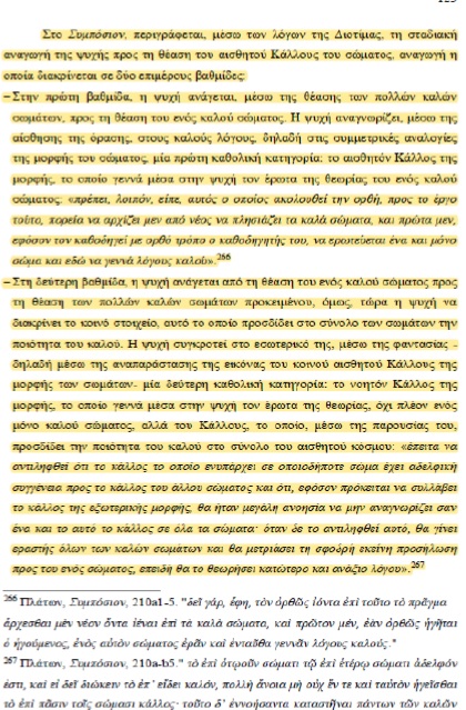«Στο Συμπόσιον ο Πλάτων μάς παραδίδει, μέσω των λόγων της Διοτίμας, τη σταδιακή αναγωγή της ψυχής προς τη θέαση του αισθητού Κάλλους του σώματος, αναγωγή την οποία διακρίνει σε δύο επιμέρους βαθμίδες: