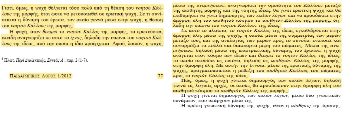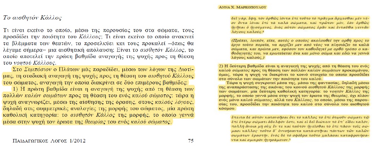 Άννα Χ. Μαρκοπούλου, «Οι διαβαθμίσεις της ιδέας του Κάλλους στο πλατωνικό Συμπόσιον και η λειτουργία των θεωρητικών αρετών», Παιδαγωγικός Λόγος (1/2012), σσ. 75-77.