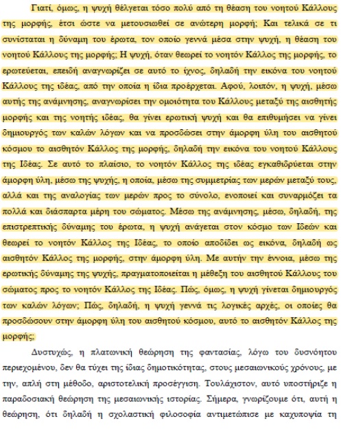 «Γιατί, όμως, η ψυχή θέλγεται τόσο πολύ από τη θέαση του νοητού Κάλλους της μορφής, έτσι ώστε να μετουσιωθεί σε ανώτερη μορφή; Και τελικά σε τι συνίσταται η δύναμη του έρωτα, τον οποίο γεννά μέσα στην ψυχή, η θέαση του νοητού Κάλλους της μορφής; Η ψυχή, όταν θεωρεί το νοητόν Κάλλος της μορφής, το ερωτεύεται, επειδή αναγνωρίζει σε αυτό το ίχνος, δηλαδή την εικόνα του νοητού Κάλλους της ιδέας, από την οποία η ίδια προέρχεται. Αφού, λοιπόν, η ψυχή, μέσω αυτής της ανάμνησης, αναγνωρίσει την ομοιότητα του Κάλλους μεταξύ της αισθητής μορφής και της νοητής ιδέας, θα γίνει ερωτική ψυχή και θα επιθυμήσει να γίνει δημιουργός των καλών λόγων και να προσδώσει στην άμορφη ύλη του αισθητού κόσμου το αισθητόν Κάλλος της μορφής, δηλαδή την εικόνα του νοητού Κάλλους της Ιδέας. Σε αυτό το πλαίσιο, το νοητόν Κάλλος της ιδέας εγκαθιδρύεται στην άμορφη ύλη, μέσω της ψυχής, η οποία, μέσω της συμμετρίας των μερών μεταξύ τους, αλλά και της αναλογίας των μερών προς το σύνολο, ενοποιεί και συναρμόζει τα πολλά και διάσπαρτα μέρη του σώματος. Μέσω της ανάμνησης, μέσω, δηλαδή, της επιστρεπτικής δύναμης του έρωτα, η ψυχή ανάγεται στον κόσμο των Ιδεών και θεωρεί το νοητόν Κάλλος της Ιδέας, το οποίο αποδίδει ως εικόνα, δηλαδή ως αισθητόν Κάλλος της μορφής, στην άμορφη ύλη. Με αυτήν την έννοια, μέσω της ερωτικής δύναμης της ψυχής, πραγματοποιείται η μέθεξη του αισθητού Κάλλους του σώματος προς το νοητόν Κάλλος της Ιδέας. Πώς, όμως, η ψυχή γίνεται δημιουργός των καλών λόγων; Πώς, δηλαδή, η ψυχή γεννά τις λογικές αρχές, οι οποίες θα προσδώσουν στην άμορφη ύλη του αισθητού κόσμου, αυτό το αισθητόν Κάλλος της μορφής;»