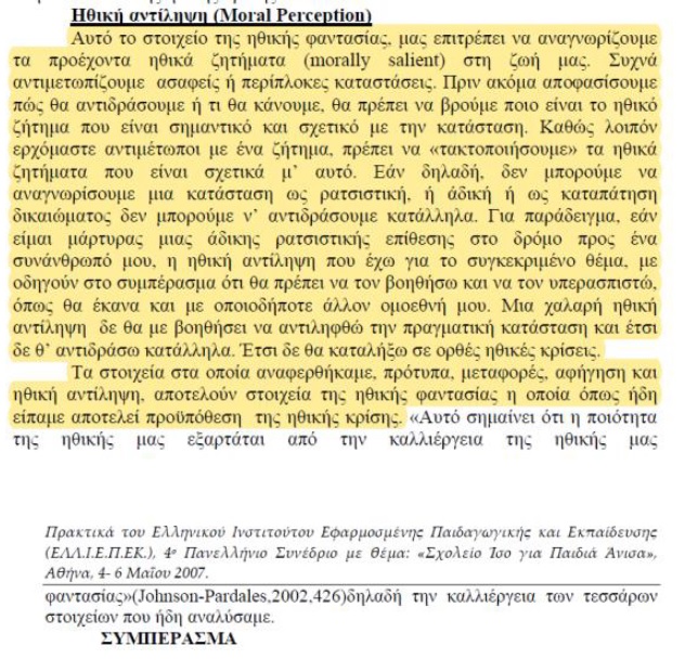 Σημ.: Η κ. Καπελέρη έχει αντιγράψει αυτολεξεί από τις Μάσσου-Μανιάτη και παρουσιάζει τα όσα γράφει ως ακριβές παράθεμα από το άρθρο Pardales, M. (2002), «So how did you arrive at that decision? Connecting moral imagination and moral judgment», Journal of Moral Education, τόμ. 31, τχ. 4, σελ 426. Στη σελίδα αυτή του άρθρου δεν αναφέρεται σχεδόν τίποτα από όσα γράφει η κ. Καπελέρη.