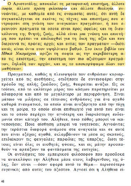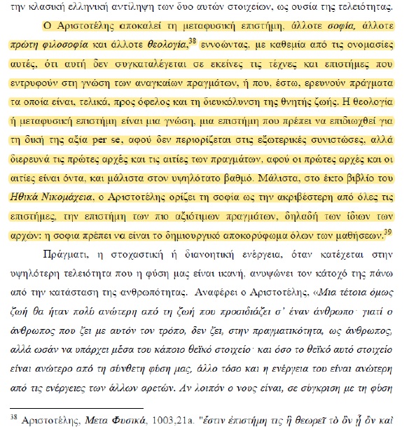 «Ο Αριστοτέλης αποκαλεί τη μεταφυσική επιστήμη, άλλοτε σοφία, άλλοτε πρώτη φιλοσοφία και άλλοτε θεολογία,38 εννοώντας, με καθεμία από τις ονομασίες αυτές, ότι αυτή δεν συγκαταλέγεται σε εκείνες τις τέχνες και επιστήμες που εντρυφούν στη γνώση των αναγκαίων πραγμάτων, ή που, έστω, ερευνούν πράγματα τα οποία είναι, τελικά, προς όφελος και τη διευκόλυνση της θνητής ζωής. Η θεολογία ή μεταφυσική επιστήμη είναι μια γνώση, μια επιστήμη που πρέπει να επιδιωχθεί για τη δική της αξία per se, αφού δεν περιορίζεται στις εξωτερικές συνιστώσες, αλλά διερευνά τις πρώτες αρχές και τις αιτίες των πραγμάτων, αφού οι πρώτες αρχές και οι αιτίες είναι όντα, και μάλιστα στον υψηλότατο βαθμό. Μάλιστα, στο έκτο βιβλίο του Ηθικά Νικομάχεια, ο Αριστοτέλης ορίζει τη σοφία ως την ακριβέστερη από όλες τις επιστήμες, την επιστήμη των πιο αξιότιμων πραγμάτων, δηλαδή των ίδιων των αρχών: η σοφία πρέπει να είναι το δημιουργικό αποκορύφωμα όλων των μαθήσεων».