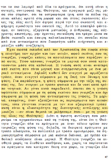 «Έχει σωστά ειπωθεί από τον Αριστοτέλη ότι σοφία είναι η επιστήμη των αρχών και των αιτιών, αφού εκείνος που τις γνωρίζει, γνωρίζει επίσης τα αποτελέσματα που πηγάζουν από αυτές. Τόσο κάποιος γνωρίζει τα μερικά όσο αυτά κατανοούνται μέσα στα καθολικά. Η γνώση αυτή είναι ανώτερη από εκείνη που είναι μερική και εναρμονισμένη με ένα μερικό αντικείμενο. Δηλαδή καθετί δεν ενεργεί με αρμόζοντα τρόπο, όταν ενεργεί σύμφωνα με τη δική του δύναμη και φύση; Για παράδειγμα, η φύση σύμφωνα με την τάξη της ουσίας της, δεν ενεργεί με τρόπο φυσικό και δε νοεί κατά τρόπο νοητικό; Αν γίνει αυτό παραδεκτό, έπεται ότι η γνώση υφίσταται σύμφωνα με τη φύση εκείνου που γνωρίζει και όχι σύμφωνα με τη φύση του αντικείμενου της γνώσης. Τα μερικά, επομένως, όταν εξετάζονται ως περιεχόμενα των αιτιών τους, τότε γίνονται γνωστά με τον πιο εξαιρετικό τρόπο αυτή είναι η ιδιαιτερότητα της διανοητικής αντίληψης και μοιάζει —αν είναι θεμιτό να μιλήσουμε έτσι— με τη γνώση της ίδιας της Θεότητας».