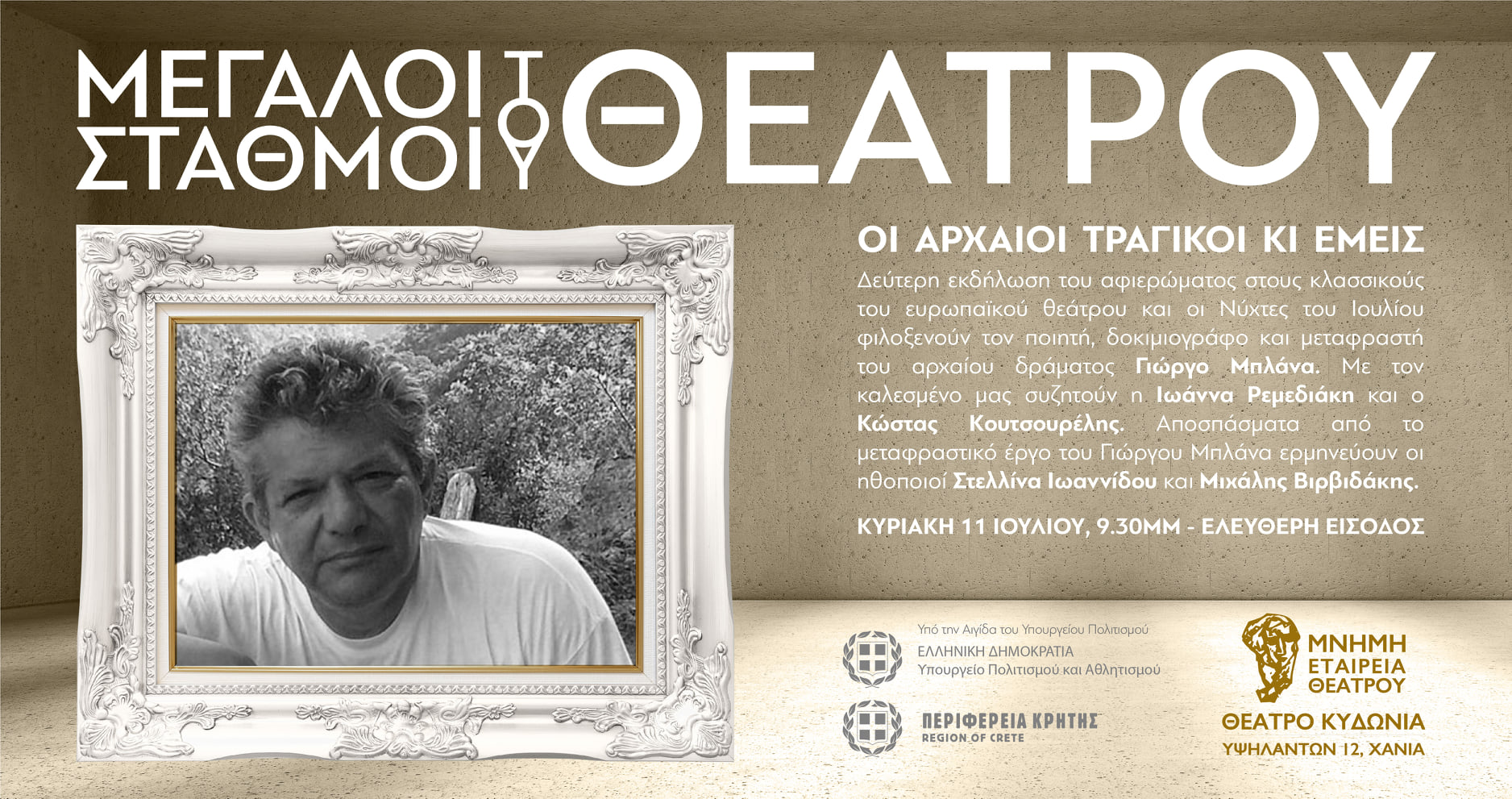 Δεύτερη εκδήλωση του αφιερώματος μας στους κλασσικούς του ευρωπαϊκού θεάτρου και οι Νύχτες του Ιουλίου φιλοξενούν τον ποιητή, δοκιμιογράφο και μεταφραστή του αρχαίου δράματος Γιώργο Μπλάνα. Με τον καλεσμένο μας συζητούν η θεατρολόγος και πανεπιστημιακός Ιωάννα Ρεμεδιάκη και ο ποιητής Κώστας Κουτσουρέλης. Αποσπάσματα από το μεταφραστικό έργο του Γιώργου Μπλάνα ερμηνεύουν οι ηθοποιοί Στελλίνα Ιωαννίδου και Μιχάλης Βιρβιδάκης.