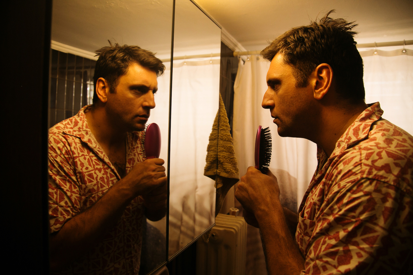 Εκ πρώτης όψεως, το Mute είναι μια παράσταση διασκεδαστική, ένα one-man show το οποίο αντλεί από τη μιμητική και από την κληρονομιά μορφών υποκριτικής περισσότερο σωματικών. Ο ανώνυμος πρωταγωνιστής —ο εμπνευστής του έργου Γιώργος Χρυσοστόμου— είναι μια φιγούρα απολύτως βουβή η οποία πηγαινοέρχεται διαρκώς μέσα στο σκηνικό. Αυτό αποτελείται από μια σκαλωσιά η οποία διαιρείται σε διάφορα τμήματα ή “δωμάτια” ορθογώνιου σχήματος. Κατά το μεγαλύτερο μέρος του έργου παρακολουθούμε τον ήρωα να περνάει από το ένα τμήμα της σκαλωσιάς στο άλλο κινούμενος αριστερά-δεξιά ή πάνω-κάτω. Τούτη η συνεχής κίνηση του ήρωα εξελίσσεται σε ένα διασκεδαστικό θέαμα (δεν είναι τυχαίο ότι μες στο κοινό στο όμορφο Κηποθέατρο Παπάγου στις 31 Αυγ. ’21 βρέθηκαν αρκετοί έφηβοι και παιδιά). Κάθε φορά που ο βουβός ήρωας μπαίνει σε έναν νέο χώρο της σκαλωσιάς η κατάσταση αλλάζει – συχνά με ρυθμό φρενήρη. Στο ένα ορθογώνιο μπορεί να ακούγεται ζωηρό ροκ εν ρολ, στο άλλο μπορεί να χτυπάει επίμονα ένα τηλέφωνο, σε ένα άλλο ο ήρωας μπορεί να ερωτοτροπεί μελοδραματικά και ειρωνικά με μια… κούκλα του σεξ ενώ σε ένα άλλο μπορεί να φωτογραφίζει εγωπαθώς τα οπίσθιά του για ένα ποστ στα μέσα κοινωνικής δικτύωσης. Τούτα τα στοιχεία ίσως οδηγήσουν κάποιον να δει απλώς μια διασκεδαστική παράσταση όπου ένας αεικίνητος παλιάτσος μάς εντυπωσιάζει με τις μούτες του και την ευελιξία του. Ωστόσο, το έργο επιζητά μια βαθύτερη ανάγνωση η οποία ίσως αναδείξει τι έχει αυτό να πει για την εποχή μας.