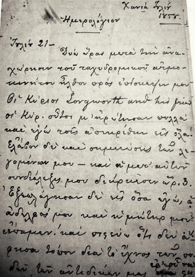 «Αυτοί ήταν υπεύθυνοι, γράφανε, που κατέβηκα στην Κρήτη. Άκου υπεύθυνοι οι Χιλλ! Και για ποιον λόγο υπεύθυνοι; Γιατί, ισχυρίζονταν, πως όχι μόνο δεν με είχαν εμποδίσει να κατέβω στα Χανιά και να διδάξω στο κοινοτικό σχολείο των κορασίων, αλλά με είχαν αποστείλει με σκοπό να πρσηλυτίσω στον προτεσταντισμό όσους μπορέσω. Δεν είναι αλήθεια. Δεν είναι αλήθεια. Έχουν περάσει πέντε χρόνια από τότε και κάθε φορά που το σκέφτομαι διαμαρτύρομαι με την ίδια ένταση, σαν να συμβαίνει τώρα. Δεν είναι αλήθεια. Δεν θα ζητούσα άδεια από κανένα, για να κατέβω στην πατρίδα μου, ούτε όφειλα να δώσω αναφορά στον οποιοδήποτε περίεργο και κακόγλωσσο για τις σοβαρές οικογενειακές υποθέσεις που είχαμε να διευθετήσουμε. Ακόμη απορώ πώς ήταν δυνατόν να υπάρχουν άνθρωποι που πίστευαν ότι οι Χιλλ θα μπορούσαν να με εμποδίσουν να κατέβω στα Χανιά, εν σωτηρίῳ έτει 1842. Ήμουν πια είκοσι τριών ετών, είχα απόλυτη συναίσθηση των επιλογών μου και την αποκλειστική ευθύνη για αυτές. Ναι, βοηθούσα τις ελεύθερες ώρες μου στην εύρυθμη λειτουργία της ιεραποστολικής Αμερικανικής Σχολής Κρήτης· βοηθούσα με τη θέλησή μου και χωρίς καμιά υλική αμοιβή· πίστευα στη δύναμη του εκπαιδευτικού και του πνευματικού έργου της, έπρεπε να κρατηθεί ανοικτή στον υποδουλωμένο τόπο μου. Και τι κατάφερα; Τίποτε απολύτως. Τη Σχολή την έκλεισαν άδικα κι απροσδόκητα εκείνοι που την είχαν ιδρύσει. Και το ζευγάρι των ιεραποστόλων πικραμένοι έφευγαν από κει, παίρνοντας μαζί τους την αγάπη του κόσμου. Είχα κι εγώ βρεθεί τότε στην προκυμαία να τους αποχαιρετήσω μαζί με το πλήθος του κόσμου και δεν μπορούσα να συγκρατήσω τα δάκρυά μου, όχι μόνο γιατί τους αποχωριζόμουν, αλλά και γιατί εγώ θα συνέχιζα να ζω μόνη σ’ ένα περιβάλλον που με απωθούσε. Είμαι νέα, με φιλοδοξίες και πνευματικές ανησυχίες, είχα και έχω ανάγκη να είμαι με ανθρώπους που να μπορώ να συζητώ και για άλλα θέματα, υψηλά κι όχι μόνο για τα ξεγελάσματα των Τούρκων και για επαναστάσεις. Η ελληνική επανάσταση με έχει πληγώσει, τα τραύματα τής προσφυγιάς υπάρχουν μέσα μου ανεπούλωτα κι ας μην είναι από τους άλλους ορατά τα ίχνη τους. Είναι φορές που νιώθω ακόμη κυνηγημένο προσφυγάκι. Η επανάσταση εκείνη διέλυσε την οικογένειά μας, αλλά δεν θα αφήσω να διαλύσει και τη δική μου ζωή».