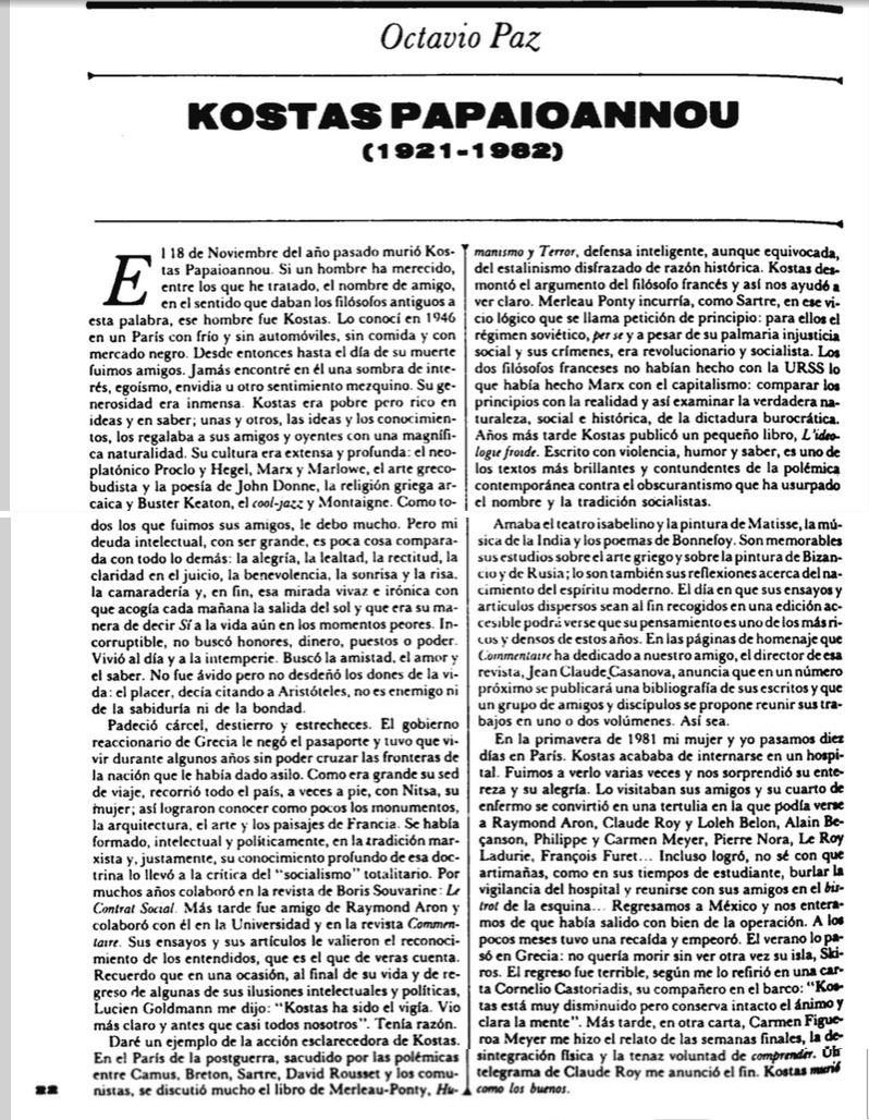 Η νεκρολογία αυτή του Μεξικανού ποιητή Οκτάβιο Πας (1914-1998) για τον Έλληνα φίλο του, τον φιλόσοφο Κώστα Παπαϊωάννου (1925-1981), δημοσιεύθηκε στο περιοδικό Letras libres (τχ. 65, Πόλη του Μεξικού, Απρίλιος 1982). Περιέχεται στον δεύτερο τόμο των Απάντων του Ο.Π. (Obras completas, Μεξικό 1994 κ.ε.) και σε μεγάλο βαθμό είναι κείμενο παράλληλο, σιαμαίο θα λέγαμε, του «Κώστα», του περίφημου ποιήματος που ο Πας αφιέρωσε στη μνήμη του Παπαϊωάννου δύο χρόνια αργότερα και έχει έκτοτε επανειλημμένα μεταφραστεί στα ελληνικά. Η παρούσα μετάφραση βασίστηκε στο κείμενο της πρώτης δημοσίευσης.