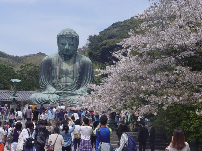 Ανηφορίζουμε για τον Αμίντα Νταϊμπούτσου, τον γιγαντιαίο Βούδδα. Σ’ όλα τα ιερά και τους ναούς τ’ άνθια ξέχειλα λευκαίνουν την όραση. Κόσμος πολύς, κινητά και κάμερες υψωμένες στην νέα οικουμενική προσευχή, την απαθανάτιση της στιγμής. Όλοι και όλα συνωθούνται εμπρός στον σκυφτό διαλογιζόμενο Βούδδα. Ο ίδιος λαμπερός κι απαθής πίσω από τα ανθισμένα κλώνια.
