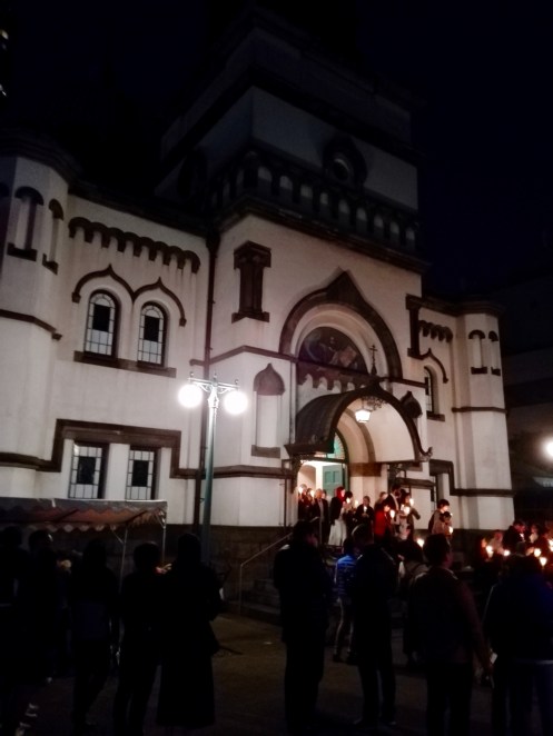 Στο τραπέζι σαν ανταλλάσαμε πασχαλινές ευχές, έριξα την ιδέα στους συνταξιδιώτες. Μαζί με κανα δυο άλλους από την παρέα, αποφασίζουμε να πάμε, με την ακλόνητη ελληνική βεβαιότητα ότι η Ανάσταση θα γίνεται κι εδώ τα μεσάνυχτα απαρεγκλίτως. Ο σταθμός μάλιστα του μετρό ήταν και σχετικά κοντά. Κατεβήκαμε και περάσαμε το ποτάμι της Κάντα κι ανηφορίσαμε προς την μαλακή πλαγιά του κάποτε λόφου μέσα στην ησυχία της βραδιάς. Ο ναός που κάποτε ατένιζε απ’ τα ψηλώματα το αυτοκρατορικό παλάτι, σήμερα βρίσκεται περικυκλωμένος από πανύψηλα κτήρια.