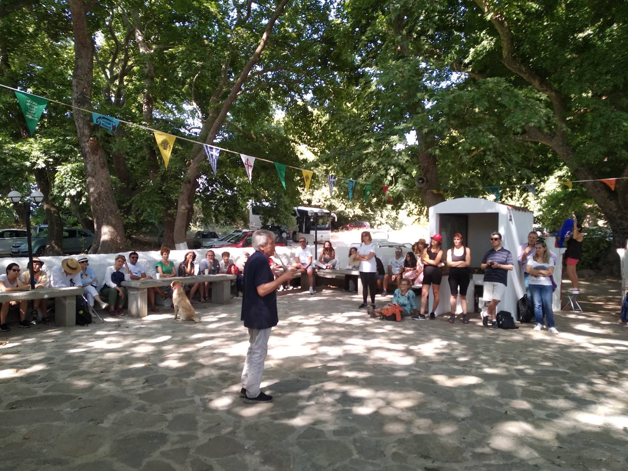 Βασίλης Κάλφας επί τρία. Όσες και οι στάσεις που κάναμε εχθές το πρωί στον Αποκόρωνα Χανίων, Κυριακή 3 Ιουλίου, στις όχθες του Κοιλιάρη ποταμού, ακολουθώντας την απολαυστική περιπατητική διάλεξή του για τον πλατωνικό Φαίδρο.