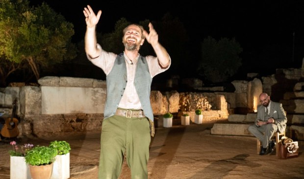 Ο Γιώργος Ραϊλάκης και ο Αιμίλιος Καλογερής από το πρόσφατο ανέβασμα του έργου στο θέατρο της Αρχαίας Απτέρας σε σκηνική διδασκαλία Μιχάλη Βιρβιδάκη.