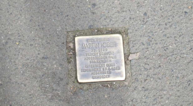 Ο άνθρωπος που σκύβει στο πεζοδρόμιο και κάτι κάνει προσηλωμένος, μου έχει δώσει την εξήγηση του τι συμβαίνει. Φοράει ένα πλατύγυρο καπέλο, έχει μακριά γενειάδα, προφανώς είναι ο ραββίνος της περιοχής. Εναποθέτει ένα ακόμα πλακάκι για κάποιον που έμενε κάποτε εδώ, πριν γίνει το εμπορικό κέντρο. Για κάποιον ή κάποια που πάρθηκε μετά βίας απ’ το σπίτι όπου ζούσε για να μεταφερθεί σε στρατόπεδο συγκεντρώσεως και να πεθάνει εκεί μέσα στον τρόμο και την αθλιότητα. Οι απόγονοι αγκαλιάζονται, φιλιούνται και κλαίνε. Στη συνέχεια αφήνουν τα τριαντάφυλλα στο μικρό μεταλλικό πλακάκι που γράφει το όνομα του συγγενούς τους, την χρονολογία γεννήσεως και θανάτου, τον τόπο του θανάτου. Τα περισσότερα πλακάκια που έχω δει γράφουν Άουσβιτς ή Τρεμπλίνκα. Πολύ σπάνια, κοιτάζοντας κάτω στα πεζοδρόμια, ανακουφίζομαι διαβάζοντας πως κάποιος δραπέτευσε ή κατάφερε με κάποιο τρόπο να επιβιώσει.
