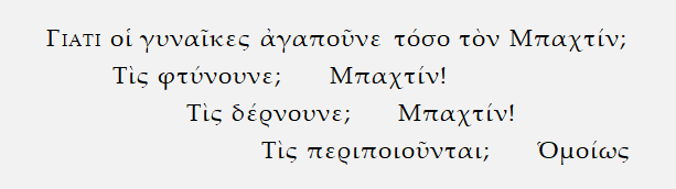 ῞Οταν λοιπὸν ὁ «ὑποκατάστατος» Μπαχτὶν τῆς πρώτης στροφῆς ἀναρωτιέται γεμάτος ἀπορία «γιατὶ οἱ γυναῖκες ἀγαποῦνε τόσο τὸν Μπαχτίν;», γιατὶ ὅταν «τὶς φτύνουνε» ὅταν «τὶς δέρνουνε» ἢ ὅταν «τὶς περιποιοῦνται» ἀκόμη, αὐτὲς στὸ μυαλὸ καὶ στὴ γλώσσα τους ἔχουν μόνο τὸ ὄνομα τοῦ «Μπαχτίν», δὲν καταλαβαίνει προφανῶς ποιόν ἐννοοῦν μὲ αὐτὸ τὸ ὄνομα. Γιατὶ δὲν ἐννοοῦν προφανῶς τὸν ἀληθινὸ δάσκαλο, τὸν σοφὸ φιλόσοφο, ποὺ εἶναι πεθαμένος πιά, ἀλλὰ ἐσένα ἐννοοῦν «ἐσένα θέλουν», τοῦ λέει ὠμὰ ὁ ᾿Αρμάος, ἐσένα παρονομάζουν «Μπαχτίν», καὶ δικαιολογημένα ἀφοῦ σὲ ἀκοῦν νὰ ἔχεις στὸ στόμα σου διαρκῶς τὸ ὄνομά του, νὰ εἶσαι τόσο συνεπαρμένος, τόσο «ἑτεροπροσδιορισμένος» ἀπὸ τὶς θεωρίες του, ποὺ δὲν εἶσαι πιὰ ἕνας ἄνθρωπος μὲ δική σου σάρκα καὶ δικά σου ὀστά, μὲ δική σου ταυτότητα καὶ προσωπικότητα, ἀλλὰ ἕνα φερέφωνό του. «Μπαχτίν» λοιπὸν εἶναι τὸ περιφρονητικὸ παρατσούκλι ποὺ σοῦ ἔχουν προσάψει οἱ γυναῖκες στὴν ὀδυνηρή τους ἀπελπισία ἀπὸ τὴν ἀνδρική σου ἀπραξία καὶ ὑπαρξιακή σου ἀπουσία.