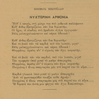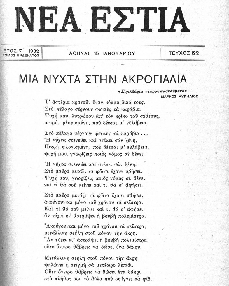 «Παντούμ. Το είπα “Νύχτα στην ακρογιαλιά”. Θα ήθελα να βρω μια λέξη που δίνει είτε το Nocturne είτε το Étude – νυχτερινό, νυχτιάτικο, σπουδή δε με ικανοποιούν. Ας μείνει ο τίτλος τετριμμένος. Έβαλα και ένα μότο από το Μάρκο Αυρήλιο προς χάρη του μεγαλείου της ΝΕ. Σε παρακαλώ να φροντίσεις να μπει σε ωραία και γυαλιστερά πλάγια στοιχεία».