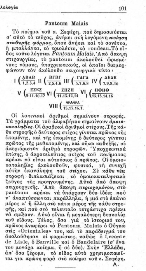 Όπως προκύπτει και από παλαιότερη επιστολή του προς τον Κατσίμπαλη, ο Σεφέρης είχε την εντύπωση ότι κόμιζε κάτι νέο στην ελληνική ποίηση, ότι εγκαινίαζε εδώ σε μας μια καινούργια φόρμα. Για τον σκοπό αυτό τη δημοσίευση συνόδευε στο ίδιο τεύχος της Νέας Εστίας ένα σημείωμα κάμποσο εξεζητημένο, εικονογραφημένο μάλιστα με μαθηματικοφανείς τύπους, περί του παντούμ και της ιστορίας του στη Γαλλία, υπογεγραμμένο με το αρχικό Α. – κείμενο ενδεχομένως του Κατσίμπαλη.
