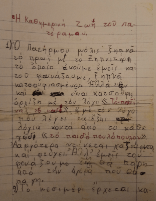 Ἀπὸ τὴ μία τὰ κολλυβογράμματα, ἡ κάκιστη ὀρθογραφία, οἱ παρατονισμοί, οἱ συντακτικὲς ἀσυνέπειες καὶ οἱ νοηματικὲς ἀσυνέχειες. Ἀπὸ τὴν ἄλλη, αὐτὸ τὸ κόκκινο μελάνι στὸν τίτλο καὶ στὸν εὐθὺ λόγο τοῦ πατέρα, μὲ ἐμφανῆ τὴν λαϊκὴ προφορικότητα. «Τὸ παιδὶ καὶ τὸ παιδί», «τὸ παιδοπουλόπουλον». Κάπου στὴ δεκαετία τοῦ ’60, κάπου στὸ Δημοτικό σχολεῖο, ὁ τὰ κοντὰ παντελόνια ἐνδυόμενος Δημήτρης γράφει γιὰ τὴν καθημερινὴ ζωὴ τοῦ πατέρα του, κεντράροντας (ἢ ὅπως θὰ ἔλεγε ἀργότερα «κεντρώνοντας», λὲς κι’ εἶναι ξεραμένη ἀμυγδαλιὰ) τὴ λέξη ποὺ γύριζε στὴν ἀπὸ κάτω ἀράδα τοῦ τίτλου (τὸ γερμανικὸ ποὺ λίγα ἢ πολλὰ χρόνια μετὰ θὰ μάθαινε ἀπὸ τοὺς πρωτομάστορες δασκάλους του).