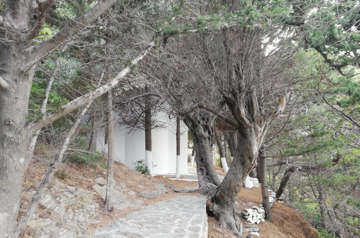 Ο περιπατητής που θα αφήσει τη βοτσαλωτή παραλία των Κουμαρών και θα ανηφορίσει προς την πλαγιά, θα συναντήσει μικρές εκπλήξεις. Η βλάστηση είναι πιο πυκνή απ’ ό,τι φαίνεται από χαμηλά και γεννά αληθινή ευφορία, με τα χρώματα και τη δροσιά της, ιδίως εν μέσω της θερινής ζέστης. Προχωρώντας, γίνεται αισθητό ότι κάπου εδώ υπάρχει ή υπήρχε νερό. Ο χωματόδρομος βρίσκει ένα πλακόστρωτο μονοπάτι, το οποίο κατηφορίζει μαλακά προς τον κόρφο της πλαγιάς. Σε λίγο, ανάμεσα στα πεύκα και τους θάμνους εμφανίζονται μερικές πεζούλες και λίγες γέρικες ελιές, σημάδια παλαιού ανθρώπινου μόχθου. Στο τέλος του μονοπατιού προβάλλει ένα ψηλό εξωκκλήσι, άσχημα επισκευασμένο, ώστε να μοιάζει σχεδόν καινούριο.