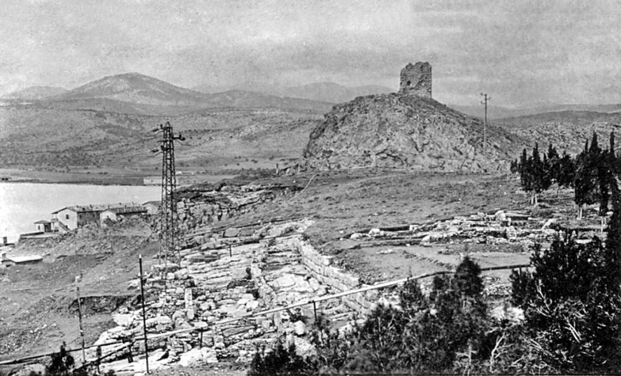 Ο πύργος της Λεψίνας λίγο πριν από τη διάλυσή του, ενώ έχει προχωρήσει η λατόμευση του λόφου. Φωτογραφία του Ιωάννη Τραυλού από το Αρχαιολογικό Δελτίο του 1960.