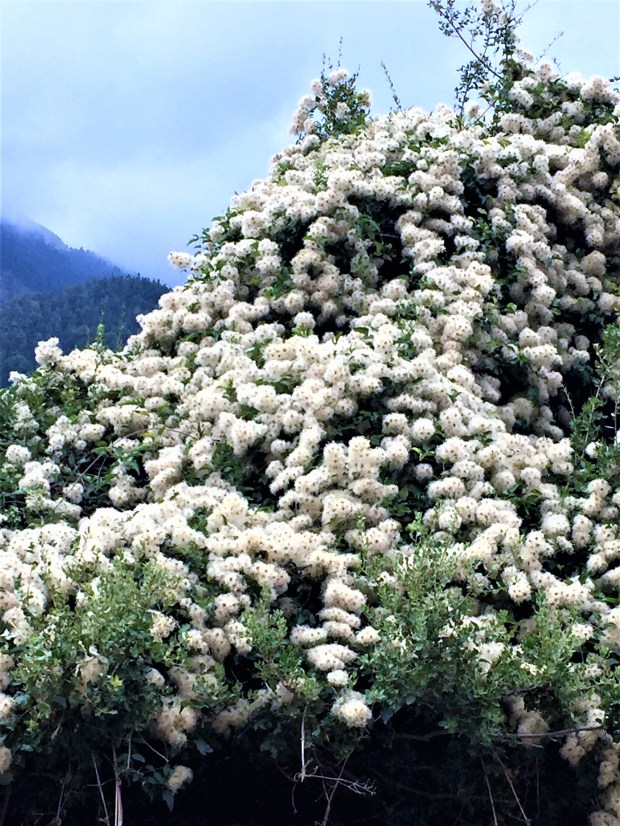 Όχι, δεν είναι πρώιμο χιόνι. Πρόκειται για την παρατεταμένη ανθοφορία της αγράμπελης, η οποία, πληθωρική κι επιθετική στο έπακρο, κάνει ολοκληρωτική κατοχή στο δέντρο-ξενιστή που την υφίσταται. Έτσι, μαζί με το επιδέξιο αυτό αναρριχητικό, λάμπει και ο μήνας Σεπτέμβριος με όλους τους διπολικούς αναστεναγμούς του. Τον παρατηρώ από άκρου σε άκρο, καθώς γίνεται σιωπηλός αποδέκτης αυτού του καταρρακτώδους λευκού.