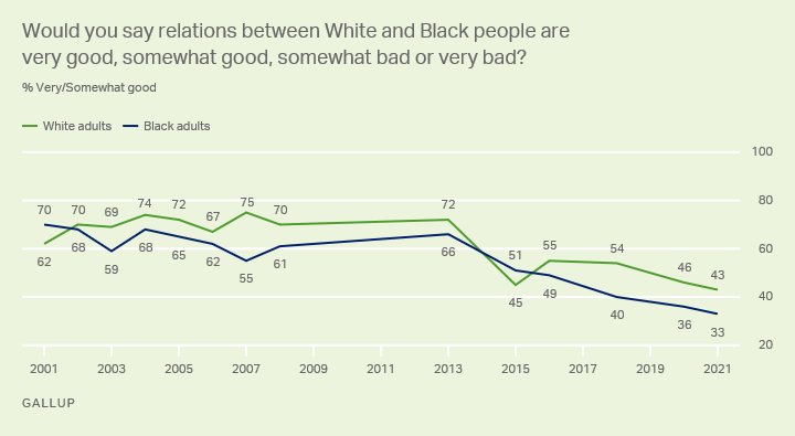 Αλλά η υποτιθέμενη έξαρση των «γυναικοκτονιών» (έχω βάλει εδώ τα νούμερα), των «εγκλημάτων μίσους» (μετονομασία του αδικήματος της «βλασφημίας» με το οποίο η εκκλησία κατέπνιγε επί αιώνες την ελευθερία του λόγου), του ρατσισμού κ.ο.κ. Είναι χαρακτηριστική η ραγδαία επιδείνωση του πως λευκοί και μαύροι βλέπουν τη συμβίωσή τους στις ΗΠΑ. Μέχρι το 2013, τα δύο τρίτα των ερωτώμενων ανεξαρτήτως φυλής, θεωρούσαν τις διαφυλετικές σχέσεις καλές. Έκτοτε, με την υιοθέτηση από κύκλους της κυβέρνησης Ομπάμα της ακραίας ρητορικής του BLM, η επιδείνωση είναι συνεχής, χωρίς τα πραγματικά στοιχεία να τη δικαιολογούν.