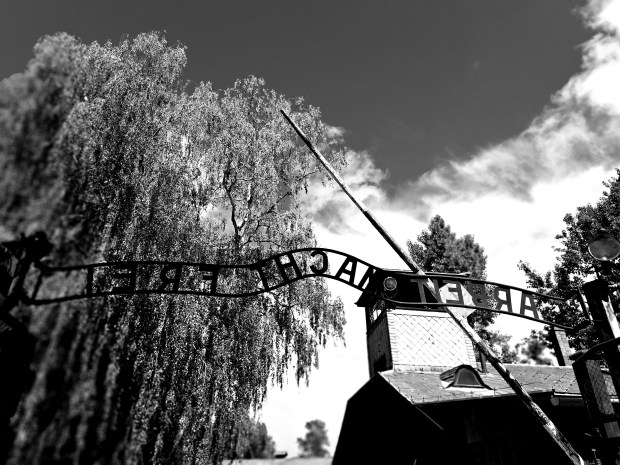 [4] Η διαβόητη επιγραφή στην πύλη εισόδου του στρατοπέδου συγκέντρωσης στο Άουσβιτς.