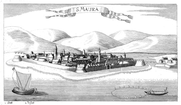 Το κάστρο της Αγίας Μαύρας δεσπόζει στην είσοδο του νησιού σαν λαβωμένος πέτρινος γίγαντας. Ο θρυλικός αυτός ήρωας σε τόσες και τόσες περιστάσεις έβαλε ή εβλήθη, έτρωσε ή ετρώθη, ενίκησεν ή ενικήθη. Είδε σιδερόφρακτους ιππότες, είδε μονόφθαλμους πειρατές. Είδε παπάδες, με τον σταυρό στο χέρι, να βγάζουν μάτια. Κι Αγαρινά σκυλιά, με το χαντζάρι στην ζώνη, να χαρίζουν ζωές. Είδε βαρβάρους να εκπολιτίζουν και πολιτισμένους να εκβαρβαρίζουν. Είδε επιδρομείς εν είδει ελευθερωτών και κατακτητές εν είδει προστατών.