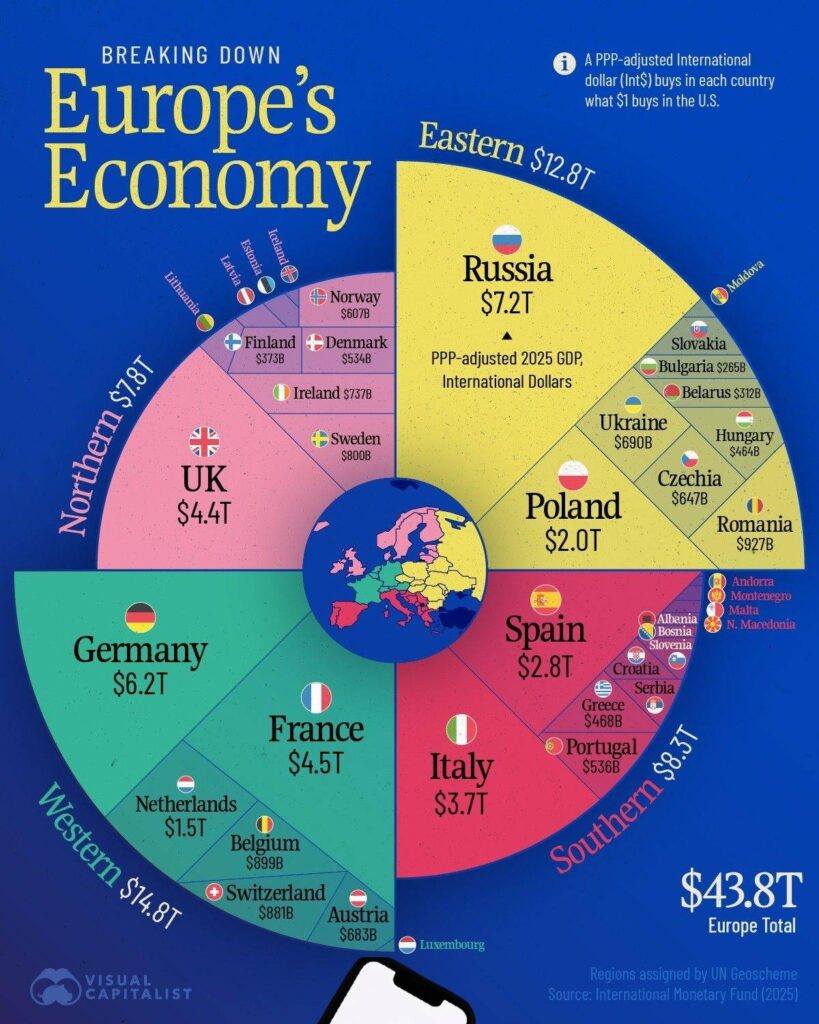 Με διαφορά πια, η Ρωσία είναι η πρώτη σε μέγεθος οικονομία της Ευρώπης σε ΑΕΠ κατά αγοραστική δύναμη – και τέταρτη στον κόσμο. Και η ειρωνεία; Τη Γερμανία και την Ιαπωνία, που ώς πρόσφατα προηγούνταν, τις έφτασε και τις ξεπέρασε μετά το 2022 και την έναρξη του ρωσσοουκρανικού πολέμου.