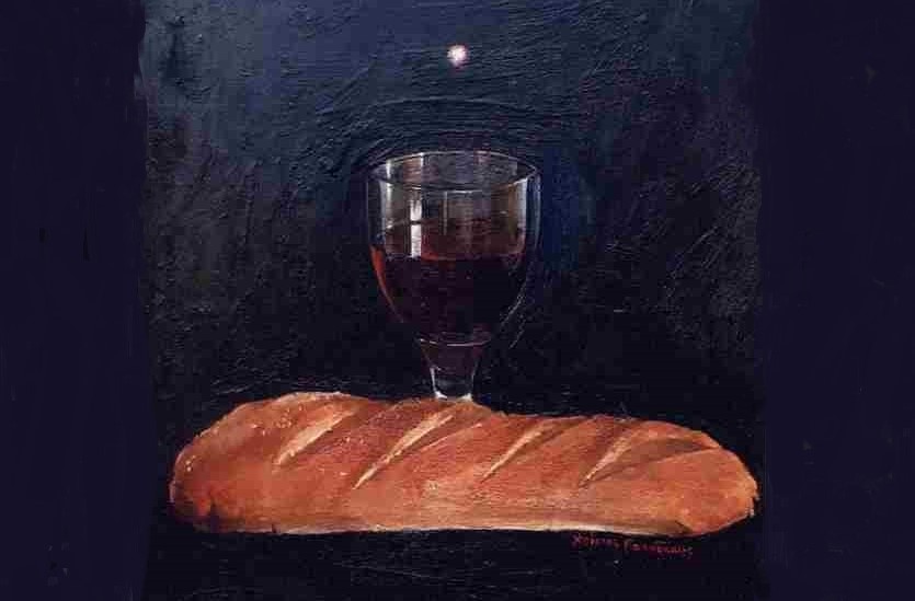 Έναυσμα να ασχοληθώ με το τελευταίο βιβλίο του Άγγελου Καλογερόπουλου μου έδωσε ο τίτλος και ο υπότιτλός του καθώς και η υπέροχη εικόνα του ζωγράφου Χρίστου Παπαδάκη («Μετουσίωσις») όπου σε μαύρο φόντο βλέπουμε μια σταγόνα φως να αιωρείται πάνω από ένα ψηλό ποτήρι μισογεμάτο με κόκκινο κρασί και πλάι του μια φραντζόλα ψωμί. Η σιωπηλή αυτή φύση (υιοθετώ τον όρο του ντε Κίρικο αντί για νεκρή φύση) όχι μόνο κοσμεί το εξώφυλλο αλλά και εικονογραφεί το νόημα του έργου.