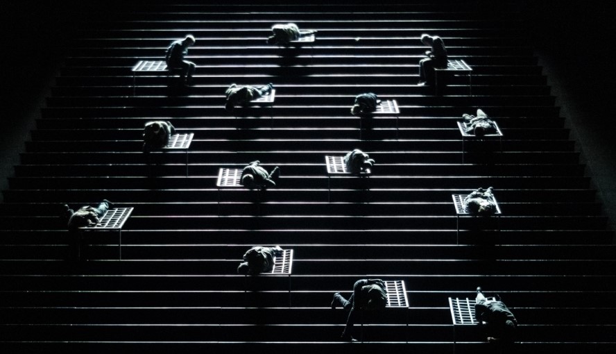 Εντούτοις, ας μην το ξεχνάμε: μιλάμε για ένα ρέκβιεμ, για μια θρησκευτική ας πούμε λειτουργία για τους πεθαμένους, μιλάμε για μια λειτουργία η οποία ξεκίνησε με την κοινωνία (με το αίμα της αδελφοποιίας να γίνεται οίνος) και η οποία συνεχίστηκε –το είδαμε– με τη χλωμή λάμψη του νεκρού να παραπέμπει στον αποκαθηλωμένο Χριστό. Τελικά, η λύση του έργου έρχεται ακριβώς μέσα από το θρησκευτικό στοιχείο. Στην τελευταία σκηνή της παράστασης, πλέον δεν βλέπουμε κορμιά να σωριάζονται στη μοιραία κλίμακα. Η σκάλα, αυτός ο ολετήρας της Ιστορίας, η πτώση μαζί και η ασθένεια του ανθρώπου, κατακτιέται: τώρα τα κορμιά δεν σωριάζονται. Τώρα, οι αντρικές μορφές του Παπαϊωάννου την κατεβαίνουν με βήμα αργό, μα σταθερό και σίγουρο. Καθένας τους κουβαλάει στην πλάτη έναν πεθαμένο… Οι μορφές τους θυμίζουν αβίαστα τον καλό ποιμένα, με το απολωλός πρόβατο επ’ ώμου – ή μάλλον με τον αμνό προς θυσίαν. Είναι ακριβώς αυτή η πράξη, η θυσία, η αποδοχή του θανάτου ως συνθήκης του βίου, που επιτρέπει την υπέρβαση της κατακρήμνισης: υπέρβαση δεν σημαίνει ανέβασμα της σκάλας και αντιστροφή του μοιραίου· σημαίνει το σταθερό εκείνο βάδισμα προς τα κάτω που συγκρατεί την πτώση και της προσδίδει αξιοπρέπεια και ιερότητα. Για του λόγου το αληθές, ο κάθε ένας κατερχόμενος χωριστά, ο κάθε ποιμένας, απιθώνει τον Άλλο που κουβαλάει (τον Άλλο ως Εαυτό & τον Εαυτό ως Άλλο) πάνω στην ιδιότυπη αγία τράπεζα που βρίσκεται στο προσκήνιο. Άλλωστε, πάνω σε αυτήν ακριβώς είδαμε πως είχε ξεκινήσει εκείνη η τελετή της αδελφοποιίας ως προσπάθεια υπέρβασης και κοινωνίας. Τώρα, από την κεντρική σορό, το αίμα τρέχει – σώμα και αίμα Χριστού. Η αρρώστια, το θανατικό, η οδύνη του χωρισμού του ανθρώπου από τον κόσμο απαλύνονται, όχι γιατί καταργήθηκε η φθορά αλλά γιατί η φοβερή πτώση μετατράπηκε σε σταθερό βάδισμα και η απελπισία σε τελετή.