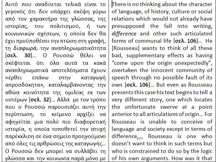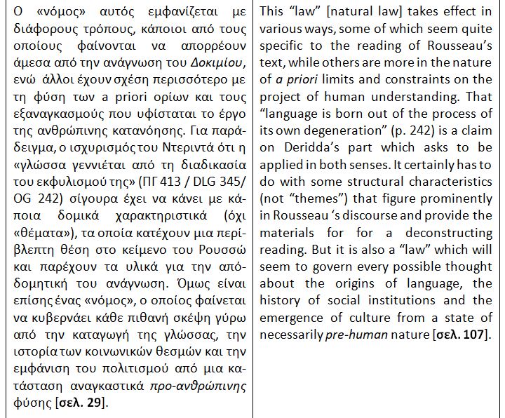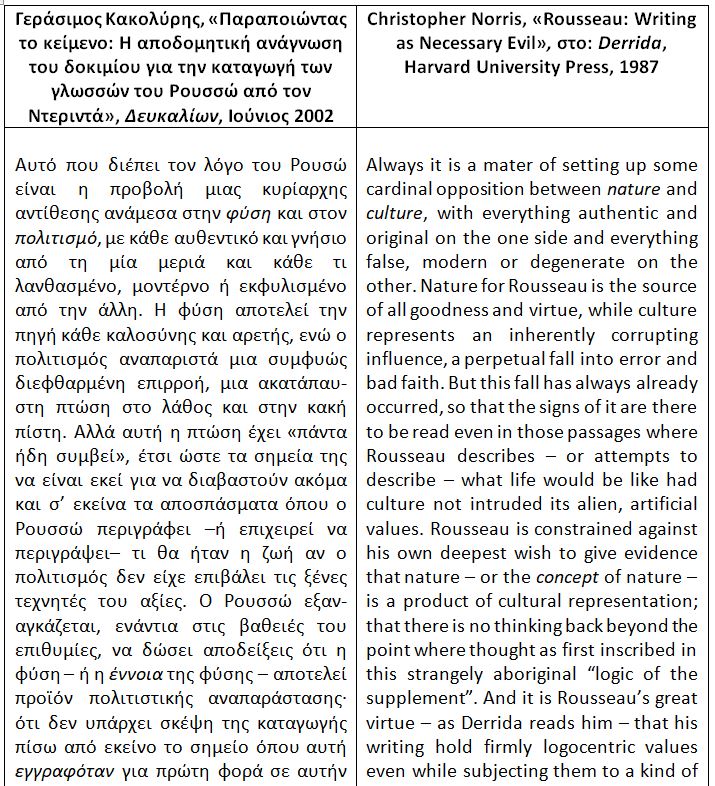 Σας γράφω εκ νέου για τον κ. Γεράσιμο Κακολύρη επειδή διαπίστωσα ότι το άρθρο του που φέρει τον τίτλο «Παραποιώντας το κείμενο: H αποδομητική ανάγνωση του δοκιμίου για την καταγωγή των γλωσσών του Ρουσσώ από τον Ντεριντά», το οποίο δημοσιεύτηκε στο περιοδικό Δευκαλίων, τεύχος 20/1, Ιούνιος 2002, και πιο συγκεκριμένα το πρώτο μέρος του άρθρου, είναι σε όλες τις κρίσιμες συμπερασματικές του στιγμές, σε εκείνες δηλαδή όπου επιχειρείται η συγκεφαλαίωση του αποδομητικού εγχειρήματος, πιστή μετάφραση, αντιγραφή ή λογοκλοπή του κειμένου του Christopher Norris, «Rousseau, writing as necessary evil» (κεφάλαιο 5 από το βιβλίο του ιδίου: Derrida, Harvard University Press, 1987). Εννοείται, βέβαια, ότι τα αποσπάσματα από το εν λόγω βιβλίο «φιλοξενούνται» στο κείμενο του κ. Κακολύρη χωρίς εισαγωγικά ή οποιαδήποτε άλλη αναφορά. Για του λόγου το αληθές, στο συνημμένο αρχείο βάζω αντικριστά τα δύο κείμενα.