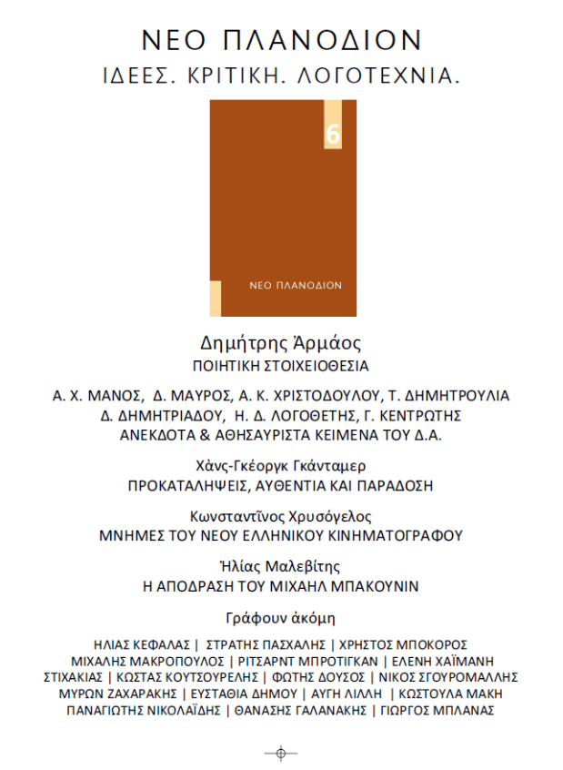 Ἐλάχιστος φόρος τιμῆς τοῦ Νέου Πλανοδίου, τὸ ἀφιέρωμα ποὺ φιλοξενεῖται στὸ τεῦχος 6 ποὺ κυκλοφόρησε πρὸ ὀλίγων ἑβδομάδων, μὲ κείμενα τῶν Ἀνδρέα Μάνου, Ἀ. Κ. Χριστοδούλου, Δημήτρη Μαύρου, Διώνης Δημητριάδου, Τιτίκας Δημητρούλια, Ἡρακλῆ Λογοθέτη καὶ Γιώργου Κεντρωτῆ, μαζὶ μὲ ἀδημοσίευτο ὑλικὸ τοῦ Ἀρμάου (μεταφράσματα Πάουντ, ἡμερολογιακὲς σημειώσεις, δοκίμιο γιὰ τὸν Μαγιακόβσκη κι’ ἕνα βυζαντινόσχημο παστίς), ἕνα συνοπτικὸ (ὅσο γινόταν!) ἐργοβιογραφικὸ σημείωμα, κι’ ὅλα αὐτὰ ἐνδεδυμένα μὲ σκίτσα, ζωγραφιές, χειρόγραφα καὶ φωτογραφίες τοῦ ἰδίου, καὶ δύο σκίτσα τοῦ Παναγιώτη Μητσομπόνου.
