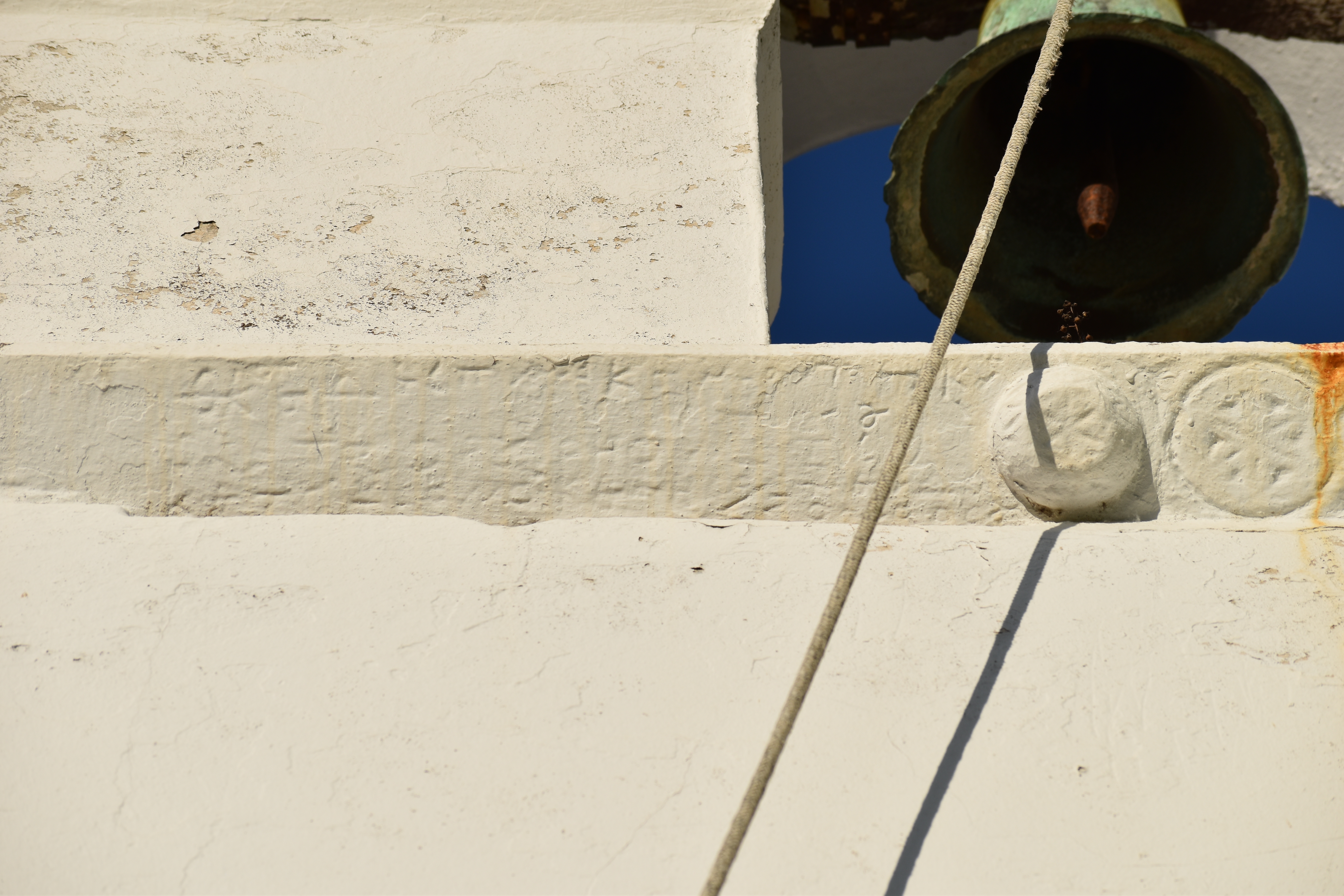Η Πρωτόθρονη στο Χαλκί, άποψη από τα βορειοδυτικά. Στη βάση του καμπαναριού διακρίνεται το γείσο με την επιγραφή — άλλοτε επιστύλιο του τέμπλου του ναού.