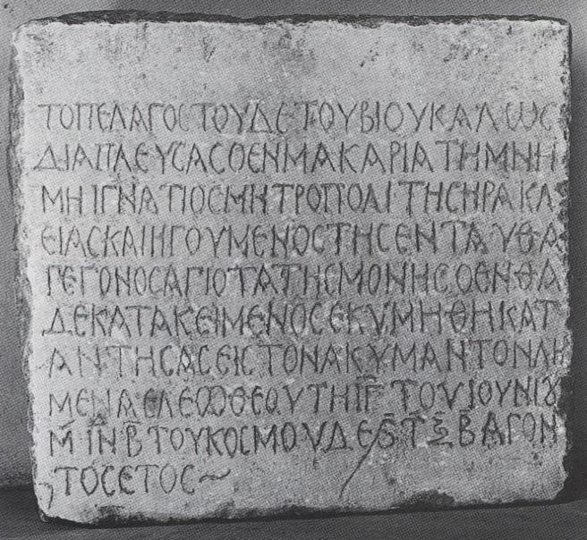 H επιτύμβια επιγραφή του μητροπολίτη Ηρακλείας Ιγνατίου, όπως τη φωτογράφησε o βυζαντινολόγος Ihor Ševčenko· είναι άγνωστο πού βρίσκεται σήμερα.