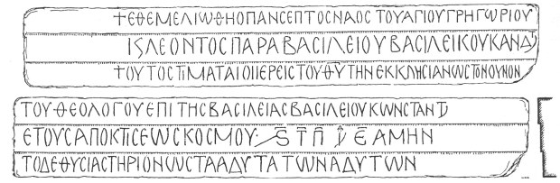 Η κτητορική επιγραφή του Αγίου Γρηγορίου Θηβών, όπως αναπτύσσεται στους δύο λίθους του επιστυλίου.