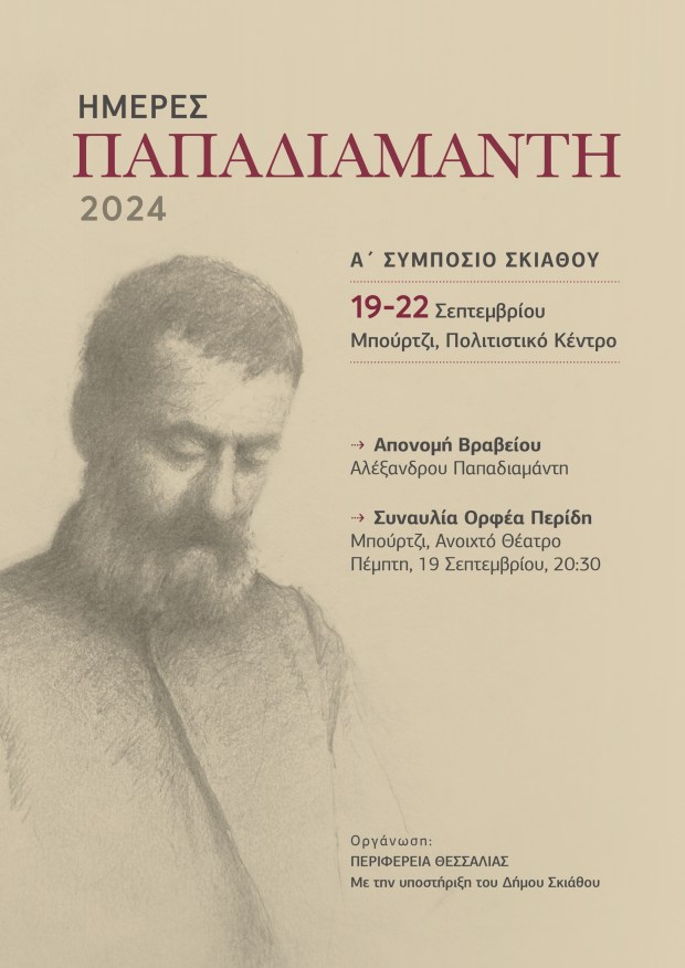 Τιμώντας τον μεγάλο Έλληνα συγγραφέα, η Περιφέρεια Θεσσαλίας εγκαινιάζει στη Σκιάθο το τετραήμερο 19-22 Σεπτεμβρίου έναν ετήσιο κύκλο εκδηλώσεων αφιερωμένων στο έργο του. Οι Ημέρες Παπαδιαμάντη 2024 περιλαμβάνουν ένα πλούσιο πρόγραμμα ομιλιών, συζητήσεων, λογοτεχνικών αναγνώσεων, συναυλιών και ξεναγήσεων σε ιστορικούς τόπους της Σκιάθου και διοργανώνονται με την πολύτιμη αρωγή του Δήμου Σκιάθου.