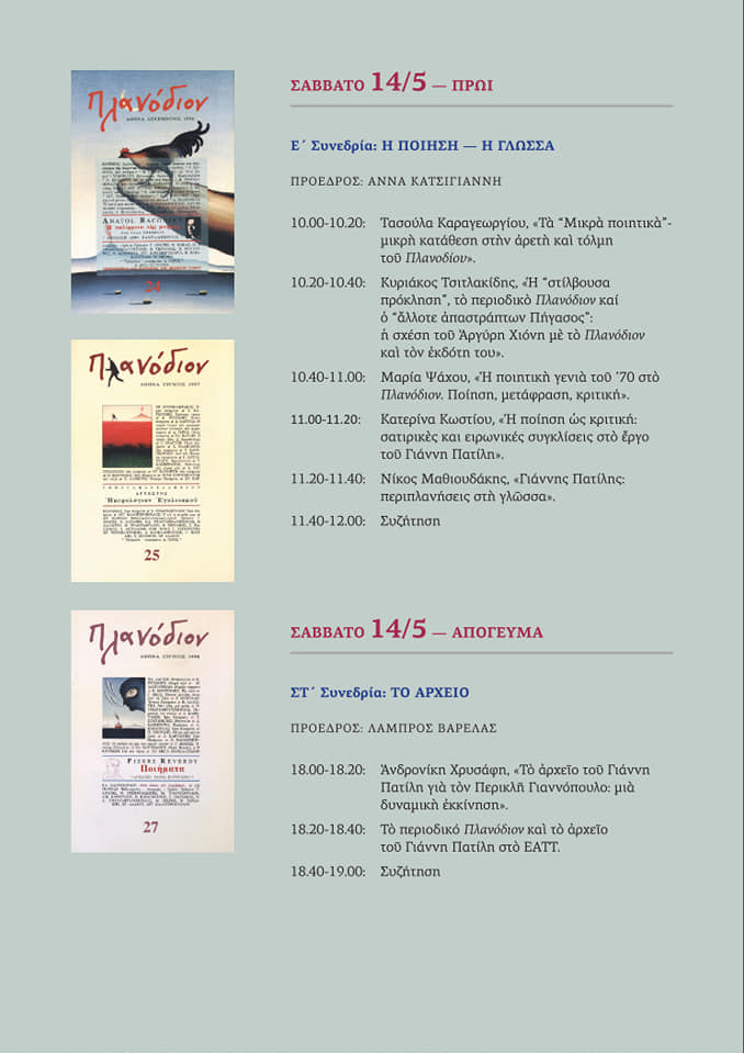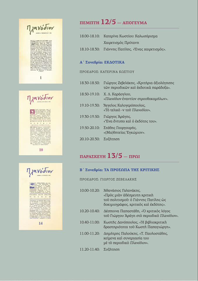 patilisgiannis-mikrostypos-tologotechnikoperiodiko-theoriaaskiseis-01Χωρίς λογοτεχνικά περιοδικά η πνευματική ζωή ενός τόπου είναι μοιραία καχεκτική και απομονωμένη. Τα λογοτεχνικά περιοδικά είναι η αναπνοή της: τη φέρνουν σε επαφή με τις άλλες λογοτεχνίες, με το μεγάλο κόσμο της φιλοσοφίας και των ιδεών. Τα λογοτεχνικά περιοδικά είναι ο φυσικός χώρος των ιδεολογικών ζυμώσεων και αντιπαραθέσεων, αν θέλουμε να γίνονται δημόσια και ανοιχτά, και όχι πίσω από κλειστές πόρτες. Είναι επίσης ο φυσικός χώρος για την παρουσίαση της λογοτεχνικής δημιουργίας. Ενίοτε είναι απαραίτητη προϋπόθεση για τη δημιουργία· το διήγημα, για παράδειγμα, ως είδος απαιτεί την κυκλοφορία περιοδικών για να υπάρξει. Οφείλουμε λοιπόν χάριτες στον Γιάννη Πατίλη που αφιέρωσε το ταλέντο και την ενεργητικότητά του στη δημιουργία και τη μακροχρόνια κυκλοφορία του Πλανοδίου. Και εκφράζουμε την ελπίδα να μεταλαμπαδεύσει τη θερμή του αγάπη για τον Μικρό Τύπο σε νέους ταλαντούχους εκδότες.