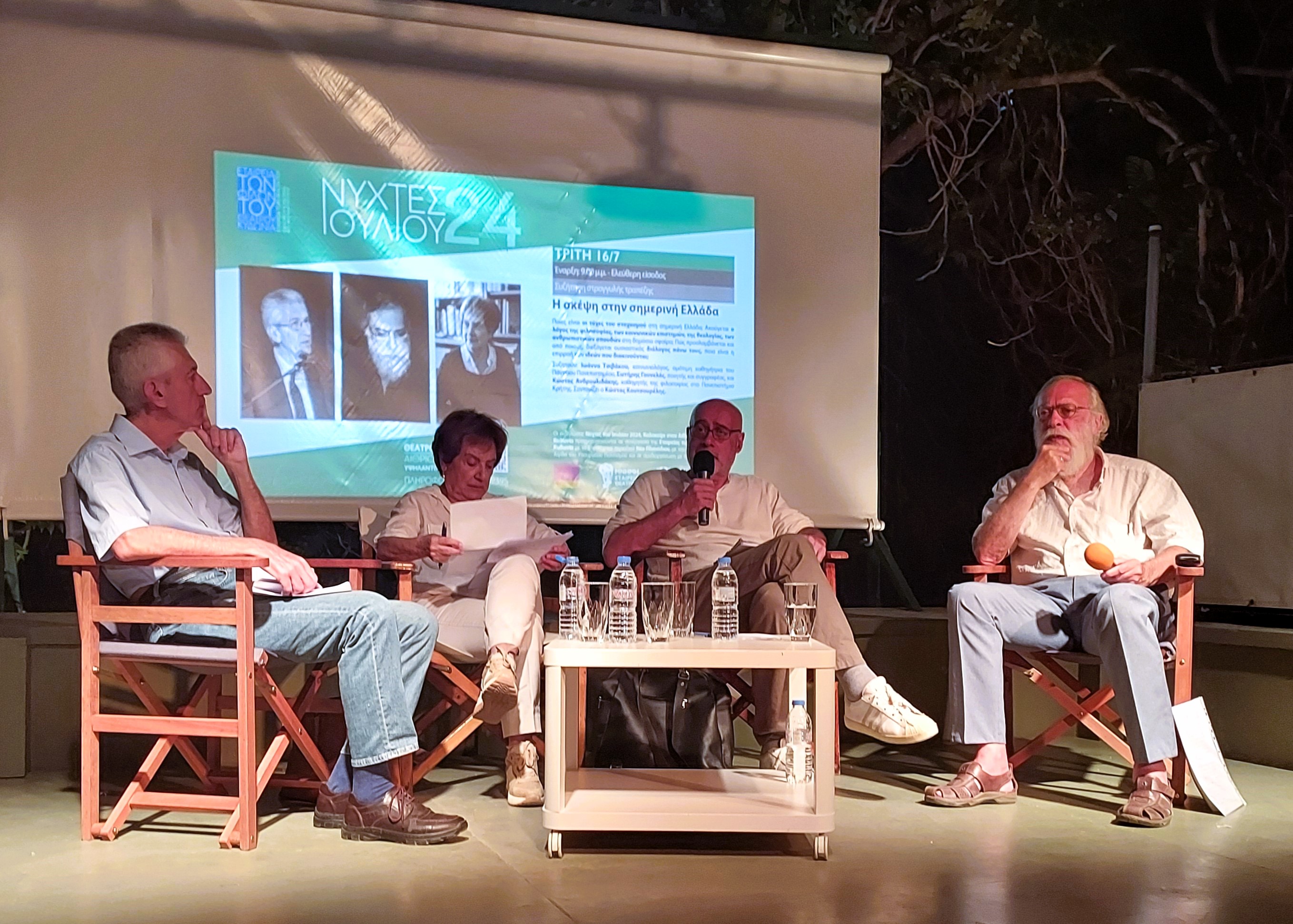 Αυτά ήταν τα θέματα που τέθηκαν στη δημόσια συζήτηση για τη «Σκέψη στην Ελλάδα σήμερα» που διεξήχθη στις 16 Ιουλίου στον Αίθριο Χώρο του Θεάτρου Κυδωνία, στις εφετινές «Νύχτες του Ιουλίου». Εισηγητές ήταν ο Κώστας Ανδρουλιδάκης, ο Σωτήρης Γουνελάς και η Ιωάννα Τσιβάκου και συντονιστής της συζήτησης ο Κώστας Κουτσουρέλης. Την εισήγηση του Κ. Ανδρουλιδάκη που δημοσιεύουμε παρακάτω, θα ακολουθήσουν προσεχώς οι ομιλίες των άλλων δύο συνεισηγητών.   —  ΝΠ
